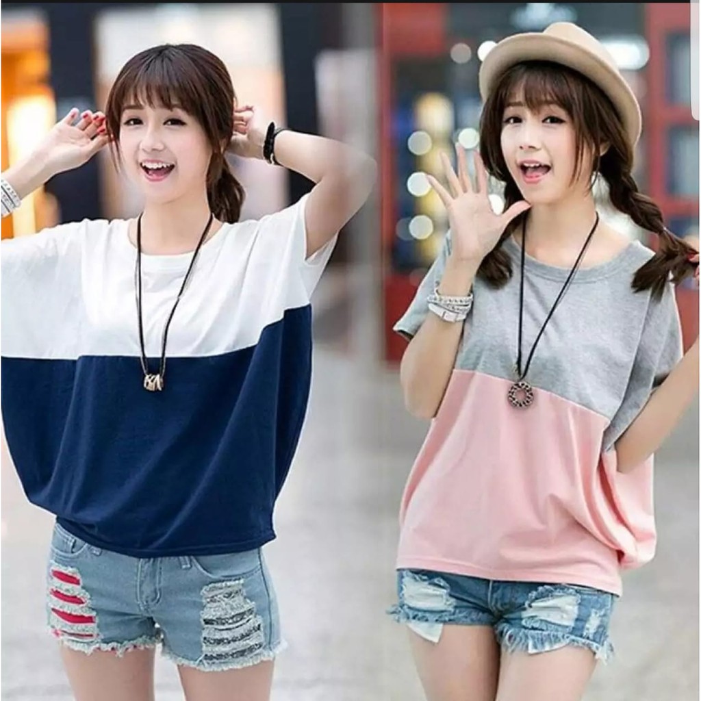 KAOS OBLONG WANITA LENGAN PENDEK KOMBINASI GAYA KOREA/KAOS OVERSIZE/KAOS JUMBO